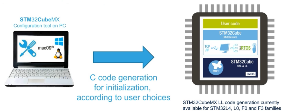 该工具用Java编写,所以可以在Windows、Linux、Mac上运行,它可以使用用户通过图形用户界面对微控制器进行配置,然后为Cortex-M内核生成初始化C代码,或者为Cortex-A内核生成Linux设备树源(下面两张图对STM32CubeMX的作用作以诠释):