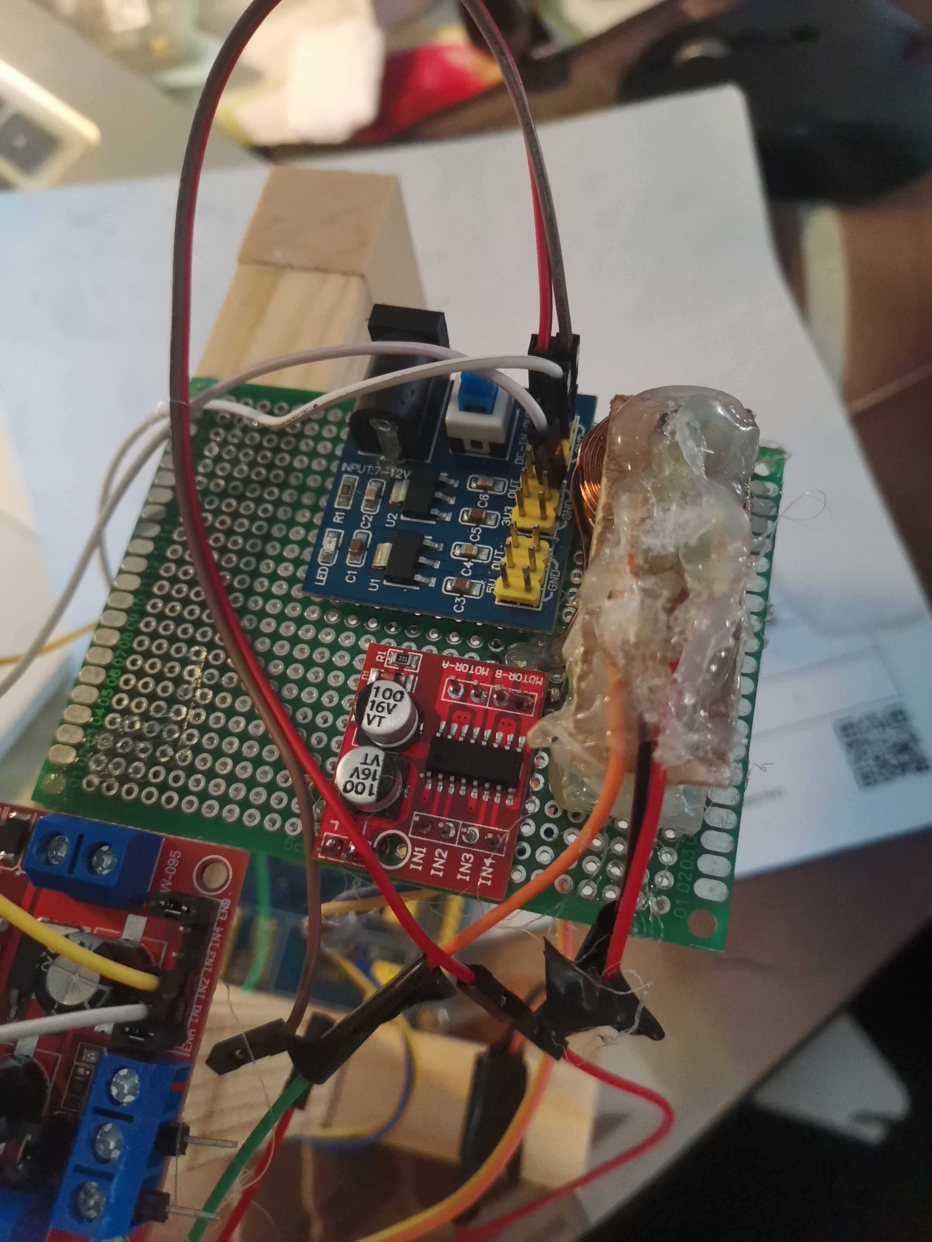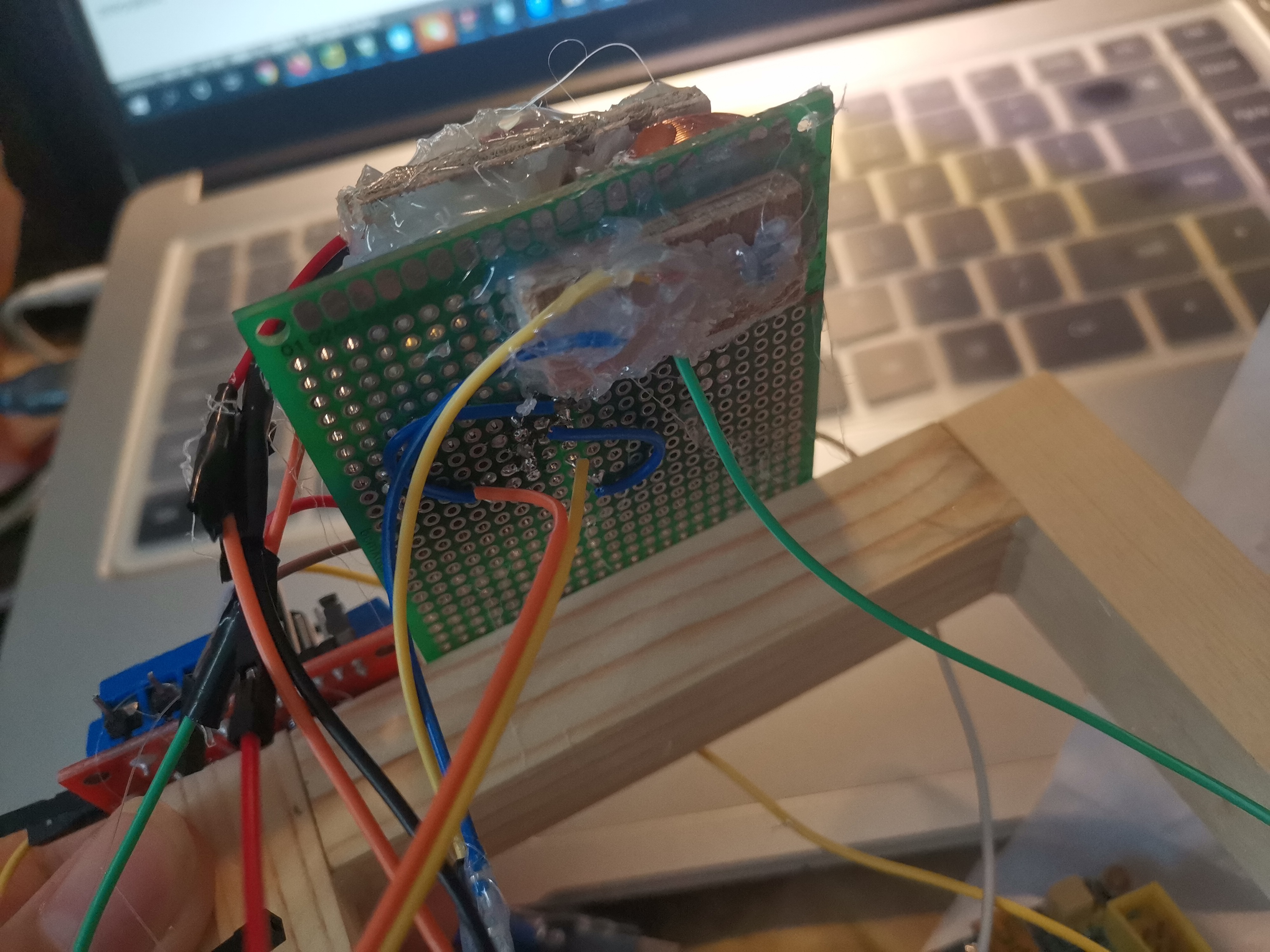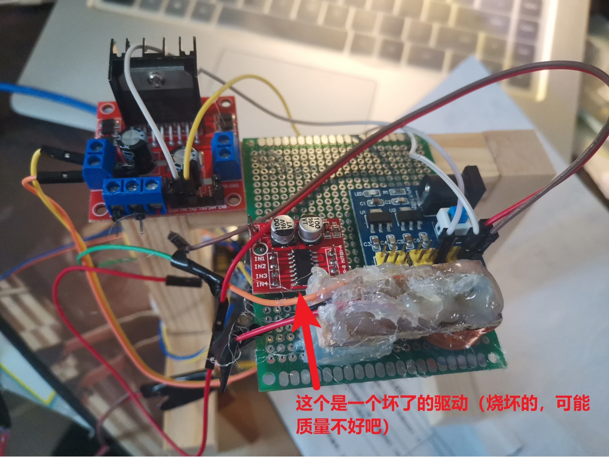 然后将硬件固定到洞洞板上,两个霍尔元件用线引出来(线最好长点)先不要固定。之后将洞洞板固定到架子上,然后先通电调试,之后写代码读取传感器示数 :
