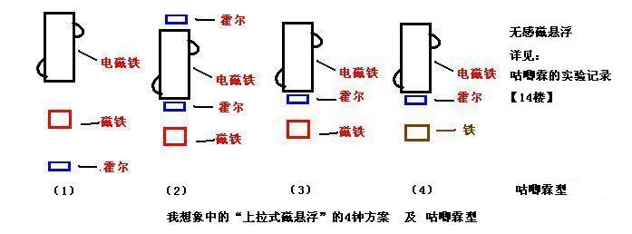首先放一张常见不常见的几种方案,图片来自阿莫论坛,图中第三种不科学(电磁铁产生的磁场会干扰霍尔,而第二种上下两个霍尔可以抵消这种影响,我刚开始就是踩得这个坑),第四种太过少见也不是很了解。最经常见到的就是第一种和第二种。还用一种是在2的上面放一个磁铁去“拉”下方磁铁以抵消重力(参考下推式的原理)