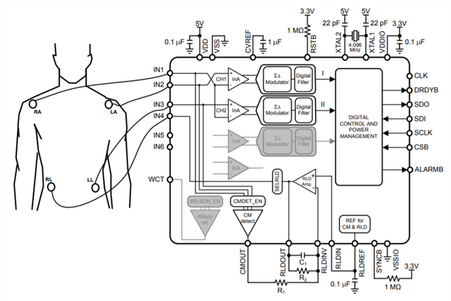 ADS1292R:单导联+呼吸检测,通道1被用来做呼吸检测。至少需要2个电极,右腿驱动的输出电极可以与LA或RA共用。