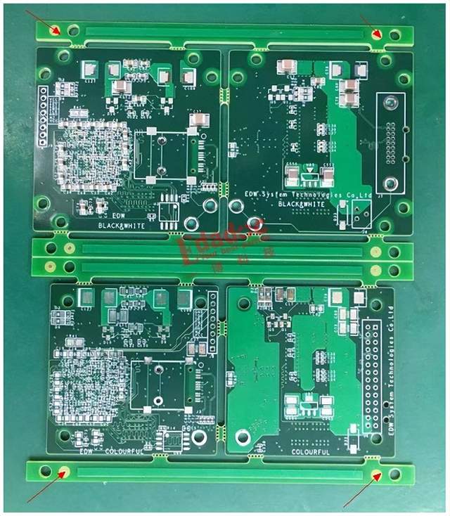 让我们回过头来看下赵理工的设计,PCB单板内无光点设计,工艺边有,但是箭头指示的地方,到板边的距离为2.5mm,贴片时被贴片机的轨道夹住,无法光学识别,中间有四个光点可以用,但是在一条直线上,无法精准定位,光学点一般在PCB板内或工艺边做成L型分布,方便精准定位。