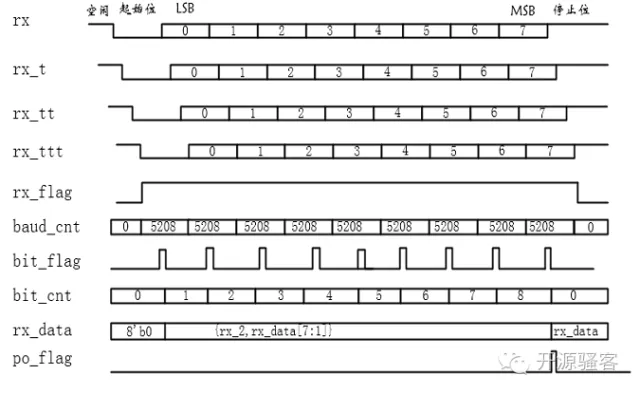 由于PC机通过串口发送的时钟域与FPGA内部工作的时钟域不一样,所以首先需要进行跨时钟域处理,对rx进行打两拍处理。 (开源骚客创始人Kevin在博客中有对跨时钟域的几种方法做详细介绍,) rx_ttt是对rx的3级寄存器,用于检测rx的起始位。当检测到起始位之后,rx_flag串口接收标志拉高,波特率计数器开始工作,当波特率计数器计数到2604(FPGA工作时钟为50MHz)时,bit_flag拉高,rx_data进行锁存接收到的串口数据。当bit_cnt计数器为8时,即表示串口的一帧数据接收完毕。
