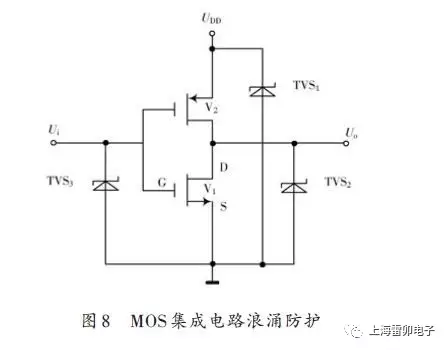 4.6 采用TVS保护MOS集成电路 MOS 集成电路的基本原件是MOS 晶体管,MOS 管有源极S、漏极D、栅极G三个电极,是电压控制元件,用变化的栅漏电压来控制漏源电流,MOS管分为P型MOS管和N型MOS管两种。由NMOS管和PMOS管组成的互补型MOS电路称为CMOS电路,它能对输出端的电容提供一个快速充放电回路,功耗小,工作速度较高,具有较强的负载能力及抗干扰能力,在数安集成电路中得到越来越广泛的应用。图8为COMS反相器保护电路图,在电路的输入端Ui、输出端Uo及电源电压UDD分别加入TVS3,TVS2,TVS1,从而保护晶体管电路及后面的负载元件。