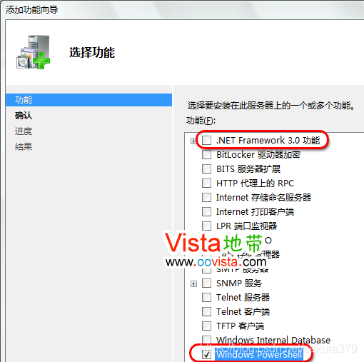 服务器管理器 图1 接下来勾选“Dot Net Framework 3.0 功能”和“Windows PowerShell”即可,如图2所示: