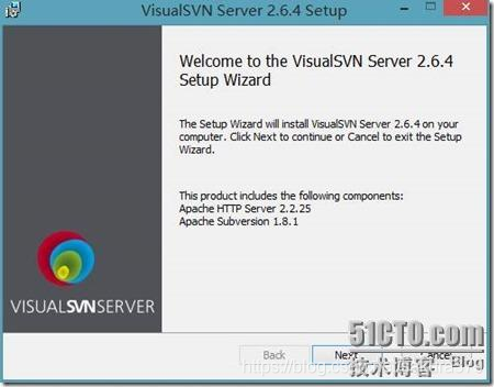 VisualSVN Server是免费的,而VisualSVN是收费的。VisualSVN是SVN的客户端,和Visual Studio集成在一起, VisualSvn Server是SVN的服务器端,包括Subversion、Apache和用户及权限管理 为什么在Windows下用VisualSVN Server而不用Subversion 因为如果直接使用Subversion,那么在Windows 系统上,要想让它随系统启动,就要封装SVN Server为windws service,还要通过修改配置文件来控制用户权限,另外如果要想以Web方式【http协议】访问,一般还要安装配置Apache,如果是新手,岂不 是很头痛?而VisualSVN Serve集成了Subversion和Apache,省去了以上所有的麻烦。安装的时候SVN Server已经封装为windws service,Apache服务器的配置也只是在图像界面上,指定认证方式、访问端口等简单操作;另外,用户权限的管理也是通过图像界面来配置。 以上内容摘自网络 下载VisualSVN2.6.4 http://www.visualsvn.com/server/download/ 运行,可以看到它包含了Apache HTTP Server和Apache Subversion