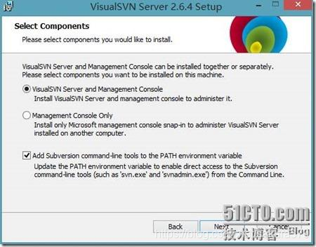 下一步,按默认的来,安装SVN服务器和管理控制台,下面也是默认勾选添加SVN命令行工具到环境变量
