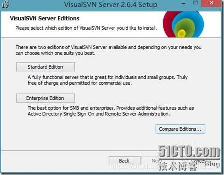 下一步,选择要安装的版本,这里选标准版,下面的企业版功能比较多,可以和AD等结合,下面的Compare Editions是让你对比两个版本的不同之处