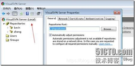 如果卸载VisualSvn Server时提示进程还在运行不能卸载的话可以把VisualSvn Server服务停掉! 开始配置 本地服务器属性里有一些参数设置,比如资源仓库的位置之类的信息!