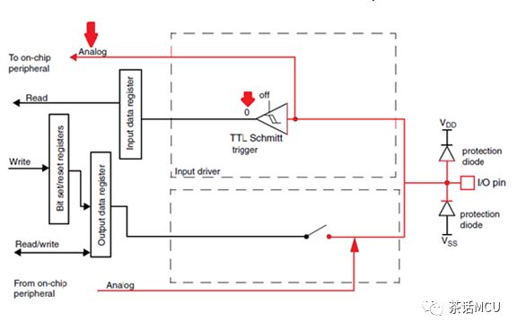 换句话说,当GPIO状态由浮空或上下拉输入状态改为Analog状态时,既消除了因为施密特触发器带来的噪声,同时又因它的关闭而降低了芯片动态功耗。