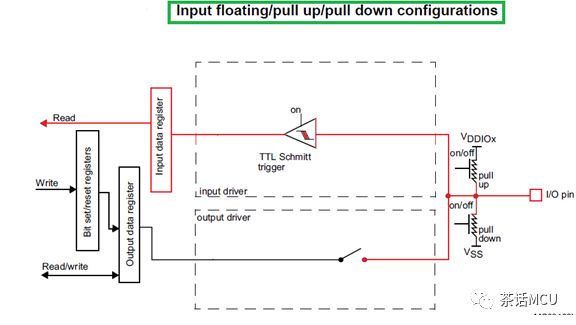 此时,输出缓冲被禁用;图中的施密特触发器被启用;IO脚的数据被采样到数据输入寄存器可被读取。上/下拉电阻根据需要可以被打开或禁用。当上下拉电阻同时被禁用时即为浮空输入模式。
