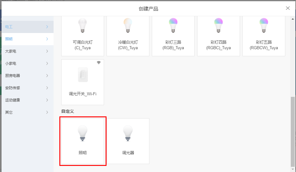 a. 选择您的产品开发模式。目前涂鸦可提供自定义产品开发和Soc产品在线开发两种产品智能化模式,您可以按需选择。我们这里选择照明-自定义-照明。