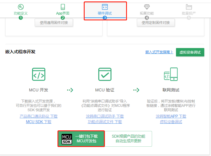 四. 移植SDK实战您可以在产品开发的第三步“硬件调试”这里下载MCU SDK。