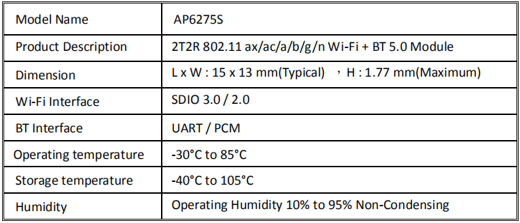 WiFi6模块AP6275S AP6275S是一个完全无缝的Wi-Fi和蓝牙功能模块漫游功能和高级安全性,还可以与不同供应商的802.11a/b/g/n/ac/ax 2x2接入点,采用MIMO标准,可达1200Mbps与双流。此外,AP6275S还包括SDIO接口用于Wi-Fi, UART/ PCM接口用于蓝牙。此外,这个紧凑的模块是一个结合Wi-Fi + BT技术的整体解决方案的模块是专为平板电脑,OTT box和便携式设备开发的。无铅设计,符合ROHS要求。