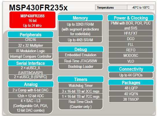24-MHz MSP430FR235x 带有 16 或 32 kB 的 FRAM (图 4)。FRAM 用于代码和数据。内存保护单元可防止意外更改程序代码。MSP430FR231x 保留了 12 位 ADC,但放弃了四个模拟组合单元。两者都可处理 -40 至 105°C 的温度范围。它们有四个可编程串行端口和一个 32 × 32 位乘法器。