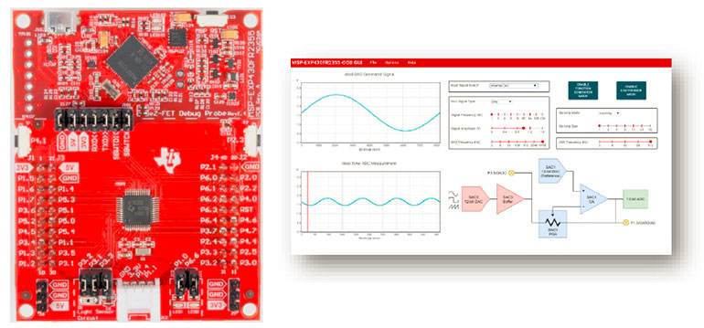 5. TI 的 LaunchPad 套件有一个 MSP430FR2355 微控制器(左)。智能模拟组合 GUI(右)允许开发人员测试配置。