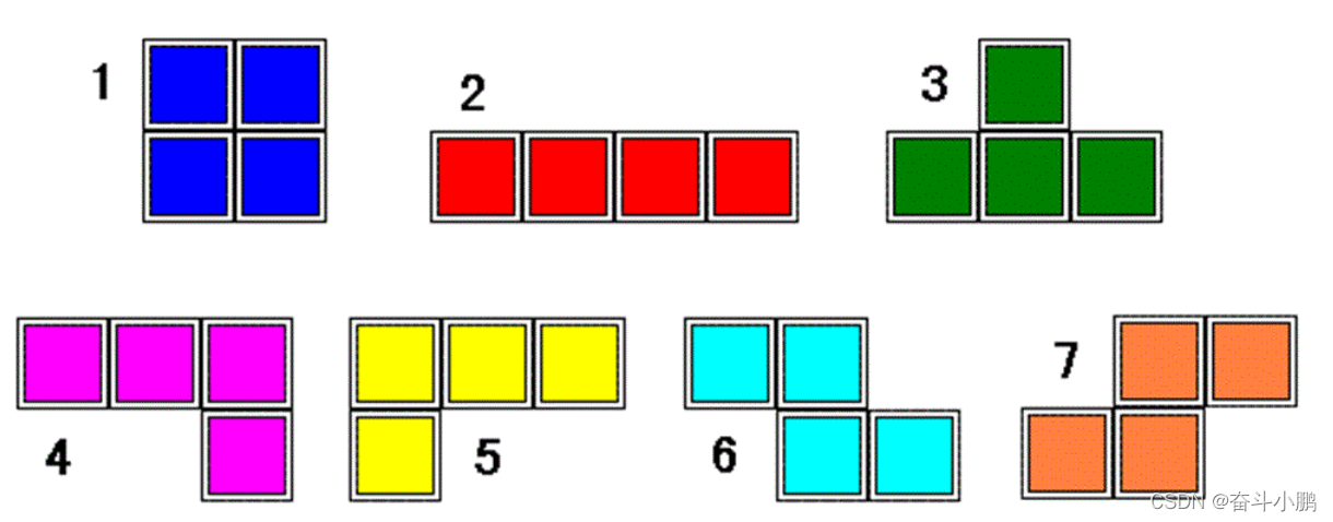 - 图形类型 : 总共七个类型,每个图形都是由四个方块组成。