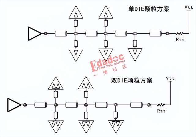 了解了芯片DIE的概念,相信各位已经能意识到我们这个案例兼容双DIE颗粒的难度了,没错,相比于单DIE方案,双DIE方案相当于接收端数量直接翻番,信号路径更加复杂,负载也更重,信号质量的恶化基本可以预见。