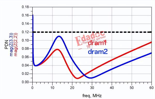 那经过仿真之后就会分别得到case1和case2在dram2处的纹波结果。 其中case1的结果就是我们仿真颗粒2自阻抗时的表现,如下图所示,的确是能满足±5%纹波的要求。