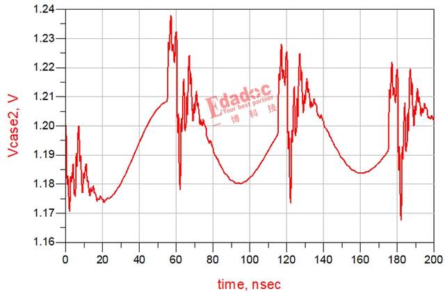 仿真后也能得到case3情况下同样在dram2位置的纹波结果,如下图。 感觉如果两个颗粒都同时拉载电流的时候,颗粒2的纹波好像±5%都hold不住了啊!仿真PDN的自阻抗是可以过的啊,为啥最后纹波却过不了啊?