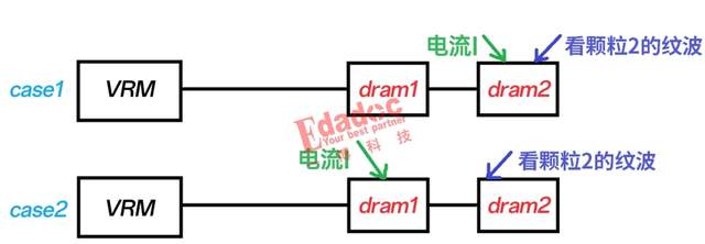 这个Z32就是我们今天要介绍的新概念,转移阻抗。那大家就好奇了,Z22和Z33的意义都知道,是表征在颗粒1和颗粒2需要拉载一定电流值的时候,由于存在自阻抗就会在颗粒处产生纹波。那Z32的意义是什么呢? 顺着大家对自阻抗理论的观点,Chris决定延伸一下。在上面的电源链路仿真中,我们分别去做下面两个case:case1是在dram2拉载电流,同时也去看dram2的纹波;case2是我们在dram1中拉载电流,然后同样还是看dram2的纹波。