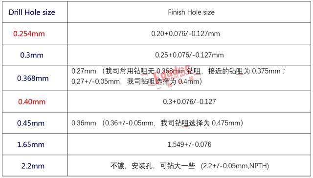 通过仿真结果证明,使用小的钻咀会对信号的差损有较好的贡献,随着钻孔孔径增大,孔的容性增大,导致孔阻抗变小。 所有的困惑与纠结已成为过去。 这一刻,曹梦宛若新生。 解决了第一个困惑,第二个问题是 资料内定义了分别定义了钻咀尺寸与完成孔径尺寸;但有些尺寸超出工厂的加工能力。 最后和客户反复沟通讨论,最终按如下的结果去生产。