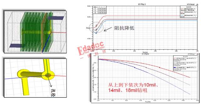 为分析增大钻孔孔径所带来信号的影响,分别增大钻孔孔径为10mil,14mil,18mil研究钻孔孔径大小对阻抗的影响。