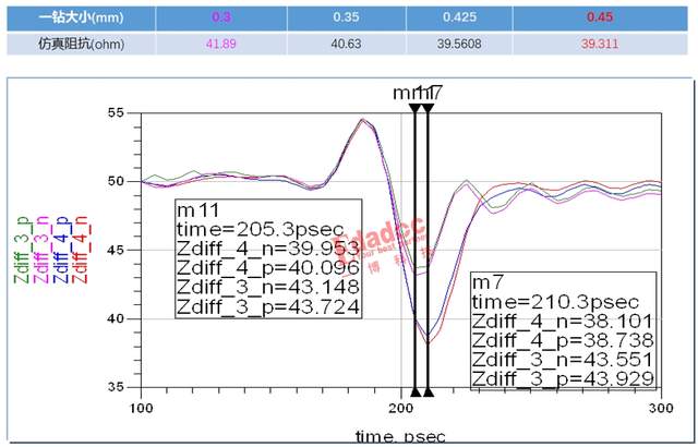 为什么要管控钻咀的大小呢,客户黄教授给了一个详细的解释。 黄教授说一钻孔的大小对过孔的阻抗是有影响的,为此他还对不同钻咀尺寸大小做了仿真。