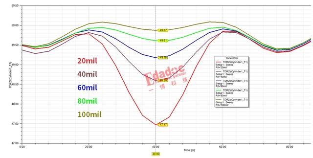 对比发现,在拐角的位置,20mil的case电场有发生明显的扭曲,100mil就基本上和直线情况没有区别。有扭曲就说明等效电容和等效电感在拐角的位置发生了变化。用更容易理解的话来说,那就是TDR阻抗发生了变化。我们可以从不同拐角的TDR阻抗对比也能明显发现这一点。