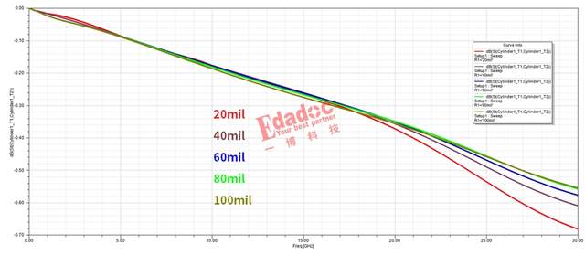 然后再看看这段走线的衰减结果,在高频也慢慢呈现出区别。仅仅这一小段的表层走线,20mil的拐角在30GHz能恶化0.2dB,这个是一个很大的恶化了。