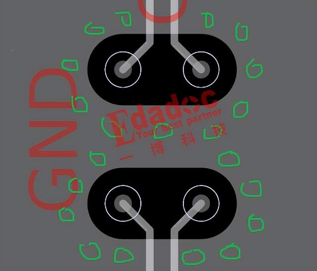 别急嘛,虽然也还是过孔,但是角度是不同的嘛。今天我们来讲讲两对高速过孔之间的串扰怎么通过合理的规划隔离地过孔放的位置来减少。说白了,我们这篇文章想研究的是两对高速信号的过孔位置定了之后,到底地过孔要放在哪个位置能最大程度的减小串扰哈!例如下面这个设计图,两对信号过孔位置固定后,要怎么加地过孔的效果最好呢?