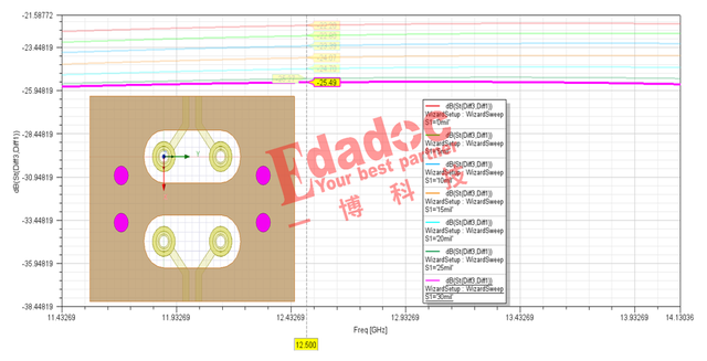 主要是上面第一个case之后得到的灵感,也就是隔离地过孔越靠近,串扰越好。然而,仿真扫描后的结果又会让大家再跌一次眼镜。对从近到远的地过孔位置进行扫描,发现靠近的是最差的(红色曲线),远离的这种反而是串扰最好的设计。