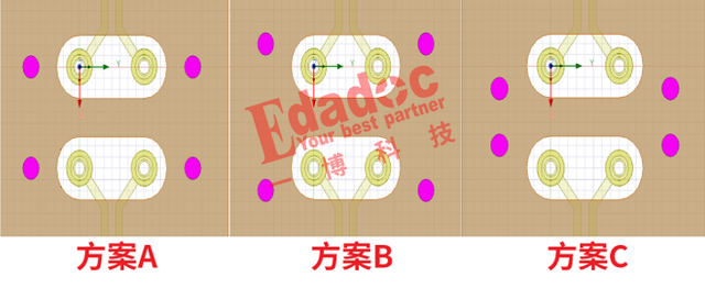 相信大部分会选择方案A的方式吧,把地过孔打在信号过孔水平方向的左右两边。对比方案A,方案B就是在竖直分别往上下远离点来打,方案C就是在竖直方向分别往上下靠近点来打。各位设计工程师你们觉得上面三种方案的串扰到底哪种好呢?